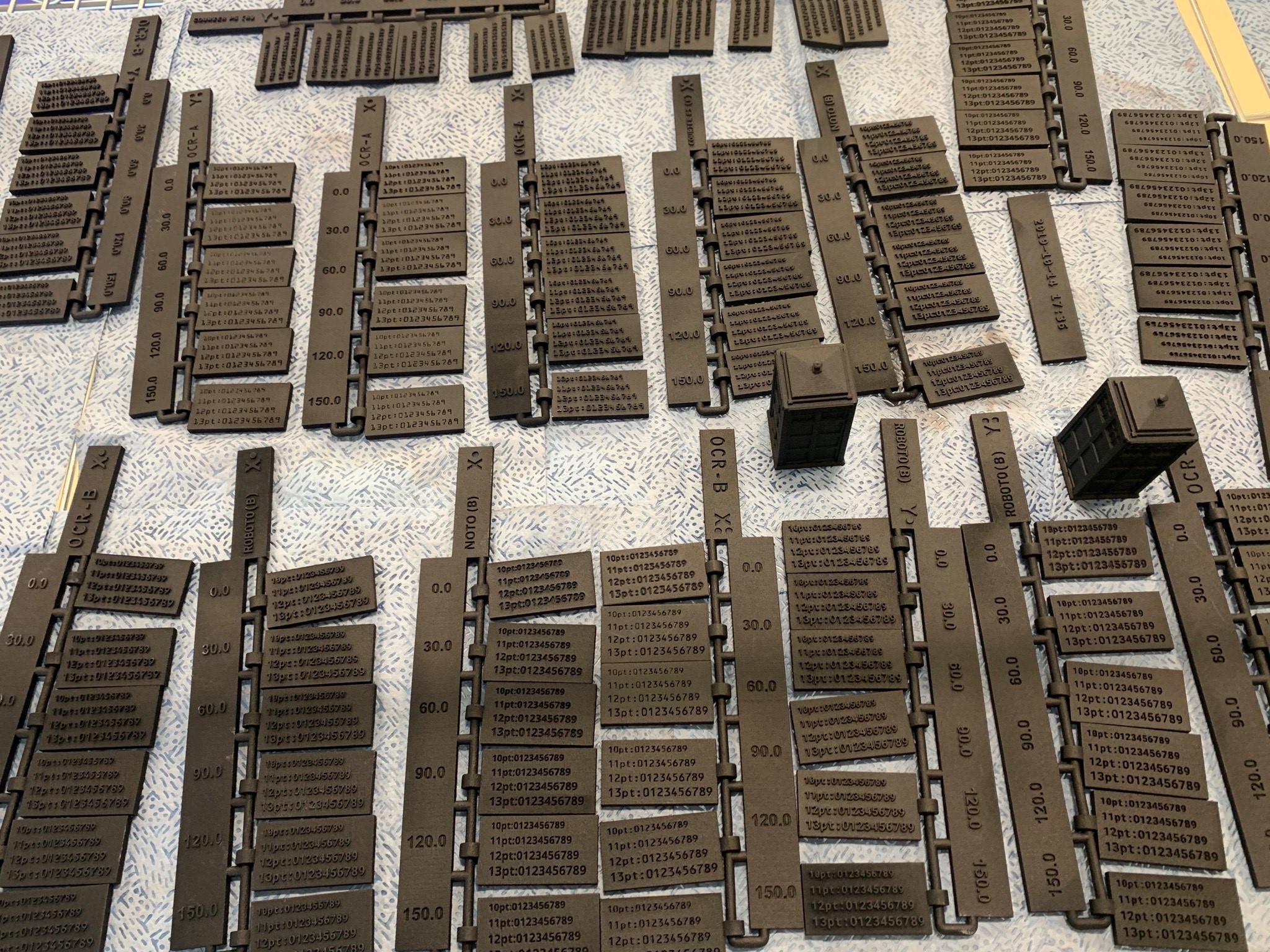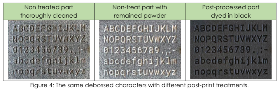 The third factor is post-printing treatments, including cleaning and post-processing. Non-uniform surface color and texture are unfortunate realities with the 5200, introducing noise that reduces the contrast between a character and its surround. Debossed text casts crisp shadows which can provide more contrast than embossed. Dyeing a part black produces a uniform color vs. undyed, dramatically reducing noise, and thus increasing edge definition and contrasts. Ironically, poorly cleaned debossed text can lead to better readability because narrow recesses trap white powder that contrasts sharply with the darker surround. We did not investigate the impacts of surface treatments like paint, clear coat, wax, tumbling, or vapor smoothing, but most coatings are used precisely to reduce noise in the surface finish, so we should expect improved contrast between label and part, and thus improved readability.
