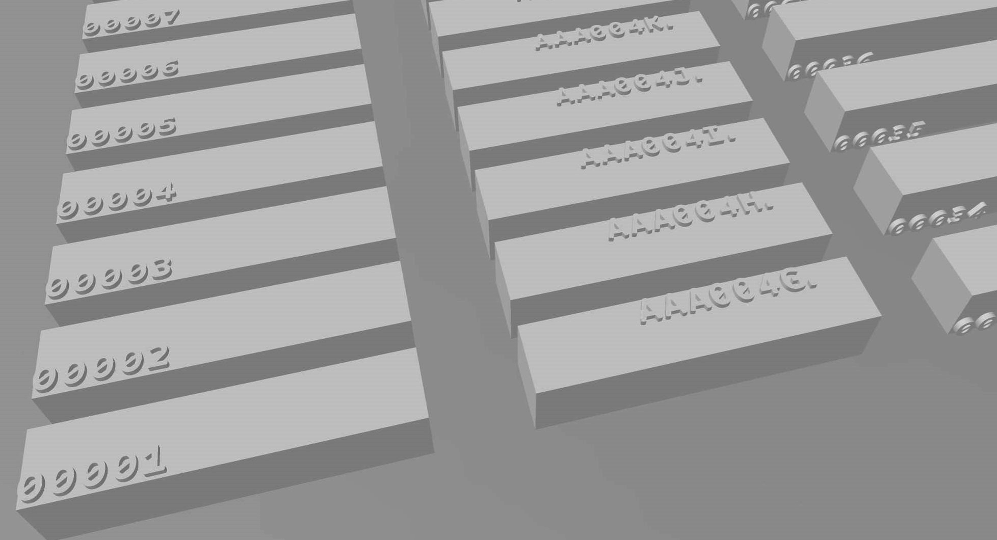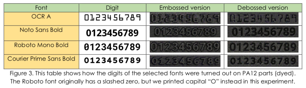 Furthermore, the individuality of characters is an important subfactor in font design, especially for making machine-readable labels. For example, some fonts have characters that are hardly distinguishable, such as lower case and upper case “O” and “0” (zero), leading to recognition errors. For this reason, we modified the CPSB font for use in the 3D printing software’s automatic labeling feature. While the Roboto Mono font is also machine-friendly, we selected CPSB due to its rounded edges and shorter height. This work is introduced with more details below. Regarding font size, we learned that it is challenging to pick a single best size for different fonts since each font is unique in its shape, ratio, and stroke width. A larger size could produce more robust and readable characters; however, it could be less space-efficient and less cosmetically pleasing.