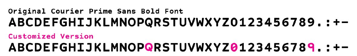 Considering the factors described above, we customized Courier Prime Sans Bold font for the automatic labeling feature of HP’s 3D-printing software. This font is available with a permissive license and it is brand neutral. We intended to use this font for creating labels optimized for MJF production, aiming for sufficient readability at any print orientation and also machine readability. We fixed the label size at 16pt (“A” is 3.37mm tall in this customized font) and used default kerning to make the outcome robust and readable on the roughest surface finish of the 180° print orientation. Also, we modified “Q” to be the same height as other capital letters to minimize the required vertical height, and we added a slash to zero and straightened the leg of number nine to make them distinguishable from similar characters for OCR and ICR.
